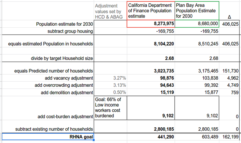 Over the last few months, HCD and ABAG staff members discussed which inputs to use in this formula, but their choices were not revealed until this week. Adjusting these inputs to be more realistic causes this number to be as high as 900,000 or even above 1,000,000 (where “population in 2030,” “number of people in each household,” and “target cost burdened rates,” are the most impactful factors).